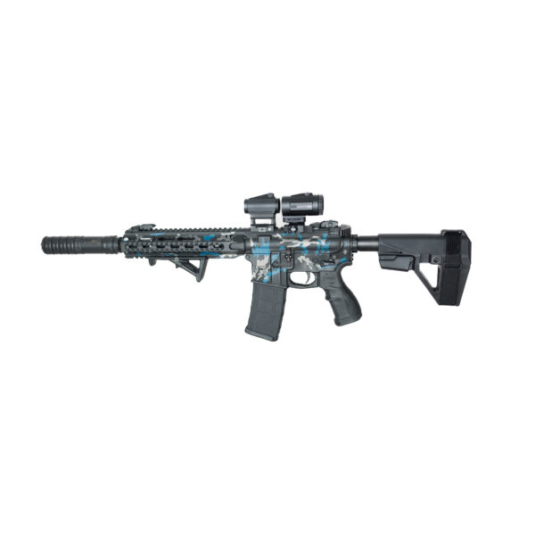 Meet Midnight Whisper—a purpose-built Fostech configuration designed for shooters who demand premium performance in a quiet, compact platform. This build centers around our battle-proven 10.5″ FLITE Eagle AR Pistol in custom blue camo cerakote. Available in 5.56 NATO.